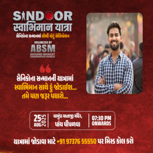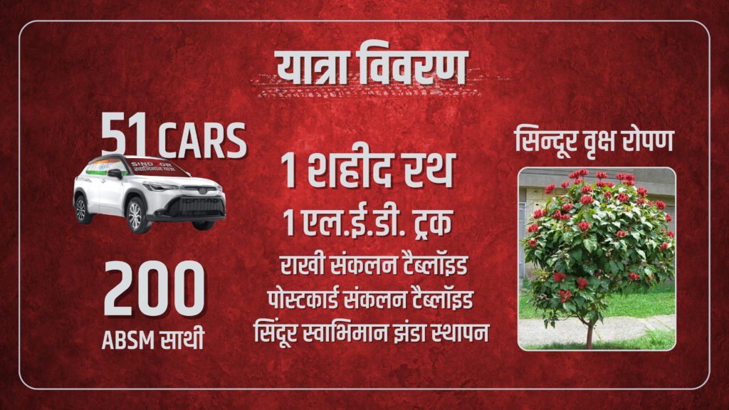 The Sindoor Swabhiman Yatra is a symbolic and inspiring journey aimed at honoring the nation’s pride, unity, and cultural values. This remarkable event will witness the participation of 51 decorated cars and 200 dedicated ABSM companions, creating a powerful visual of solidarity and commitment. The convoy will be led by a Shaheed Rath, paying tribute to the brave martyrs, followed by a modern LED truck that will display impactful messages, visuals, and information throughout the route.