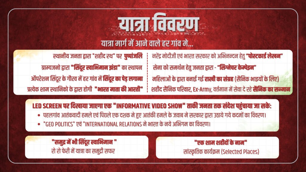 In addition to the patriotic events, the yatra will also contribute to environmental sustainability with the Sindoor Tree Plantation, a meaningful gesture promoting ecological balance and symbolizing life, growth, and resilience. The journey blends tradition, remembrance, and environmental responsibility, making it not just a yatra, but a movement for collective pride and awareness.